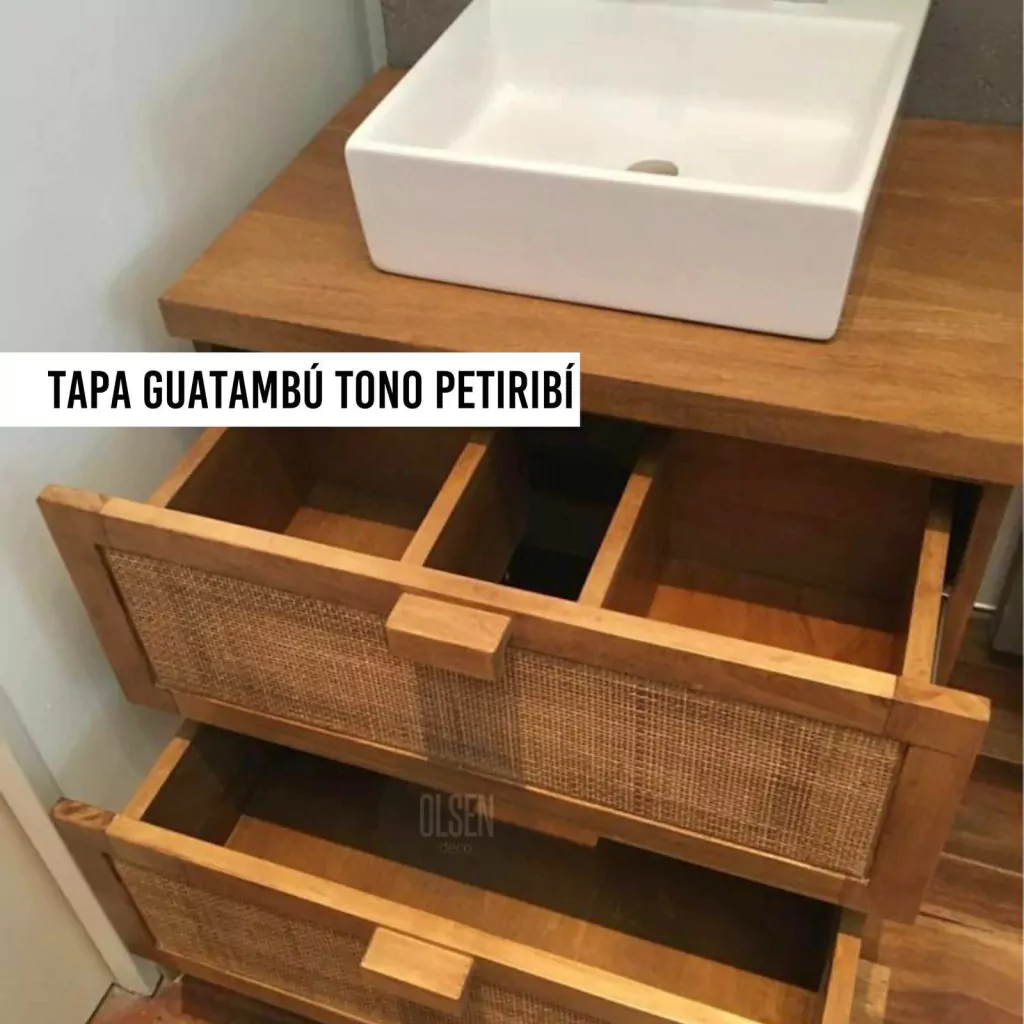 Mueble: Enchapado de 18 mm guatambu tono peteribi - Frente de cajon: de madera de guatambu macizo con esterilla americana - Base: de madera de guatambu macizo - Cajones: equipado con cajones con guias telescopicas, poseen un almacenamiento práctico - Acabado: todo el mueble tiene terminacion laca al poliuretano incoloro. Garantizando durabilidad y resistencia.